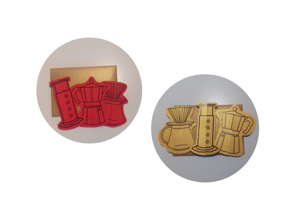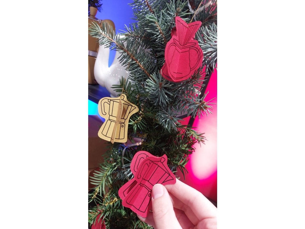 Ozdoby s kávovou tematikou. V malé zlaté obálce najdete 3 červené nebo zlaté ozdoby s motivy moka konvičky, filtru a aeropressu.